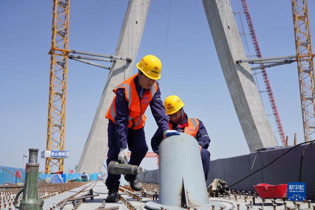 4月29日,工人在石家莊市學府路東延跨太平河橋主橋合龍現場施工。