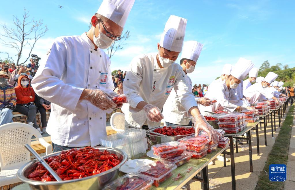4月29日,廚師在盱眙縣第一山歷史文化街區準備免費派發小龍蝦。