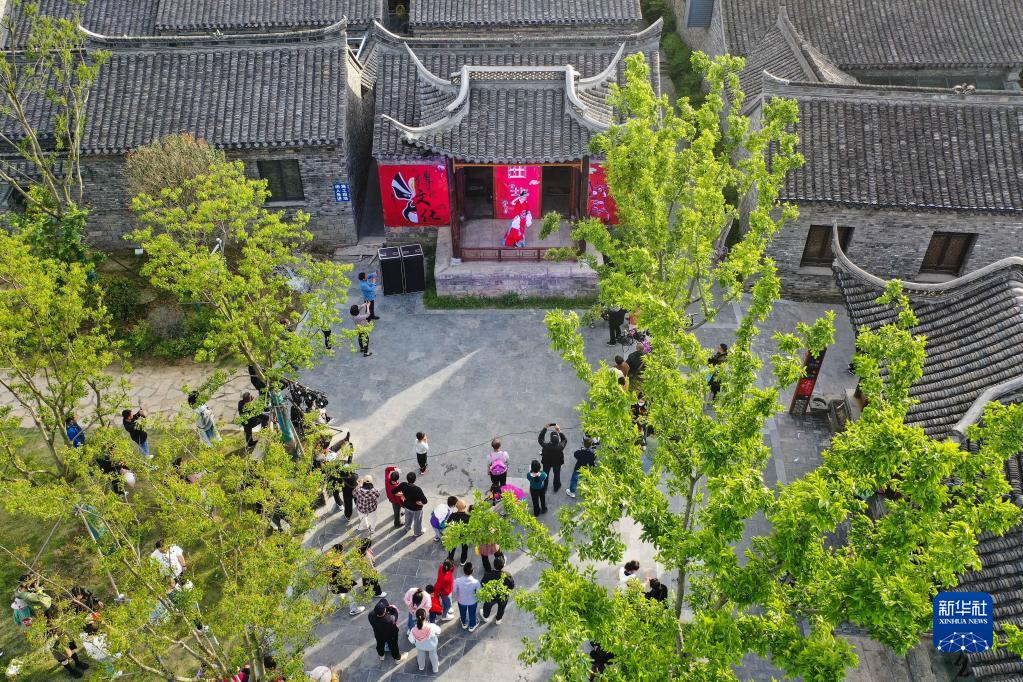 4月29日,市民和游客在盱眙縣第一山歷史文化街區觀看黃梅戲(無人機照片)。