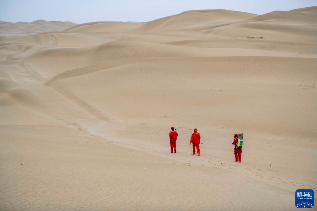 東方地球物理公司新疆塔里木物探處的工人馮永生(前)、馮雙生(中)、馮志鵬在沙漠中進行測量定位,標記鉆井點(2021年2月25日攝)。