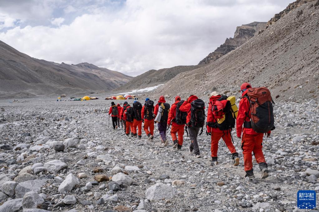 “巔峰使命”珠峰科考隊員在完成登頂科考任務后,返回海拔5200米的珠峰大本營(2022年5月5日攝)。