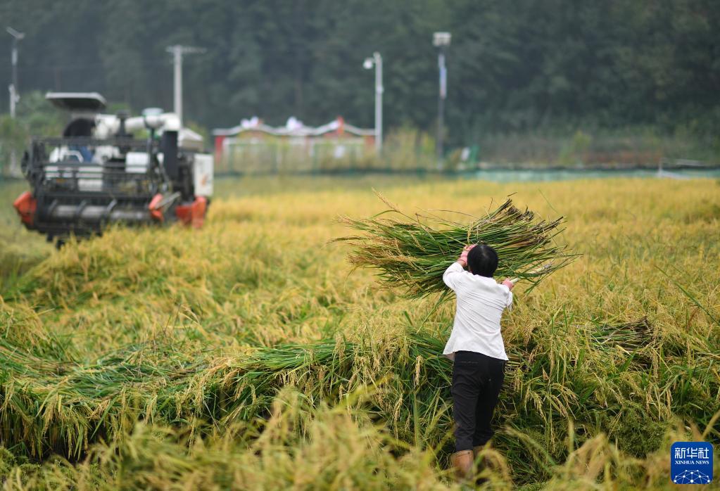 在陜西省漢中市洋縣龍亭鎮一處稻漁綜合種養基地,農民在收割水稻(2022年9月15日攝)。