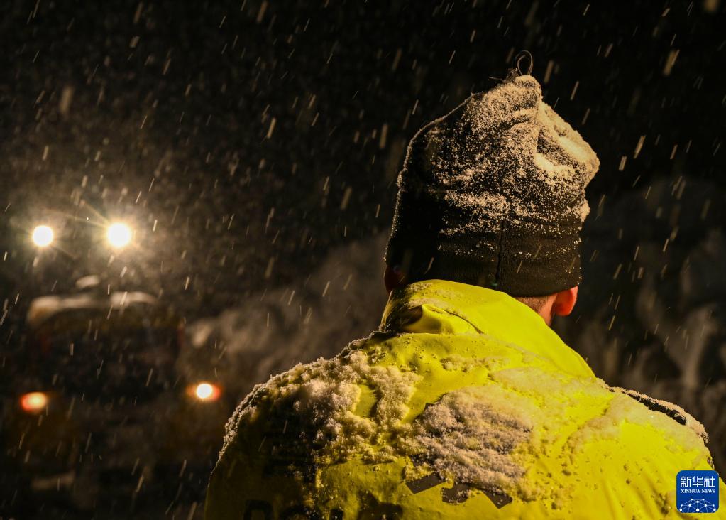 新疆喀納斯景區公安局交警大隊民警馬國軍在一處山路雪崩救援現場工作(2023年1月8日攝)。