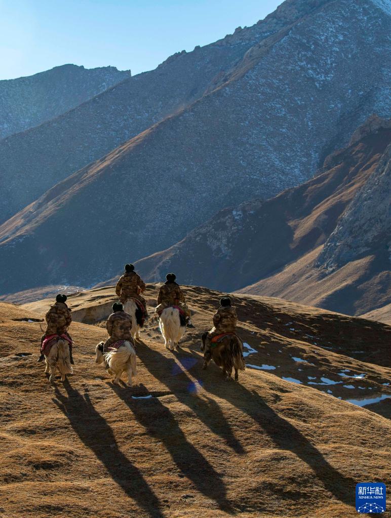 在昆侖山腹地,新疆生產建設兵團第三師圖木舒克市葉城二牧場三連職工騎著牦牛行進在巡邊路上(2020年12月25日攝)。