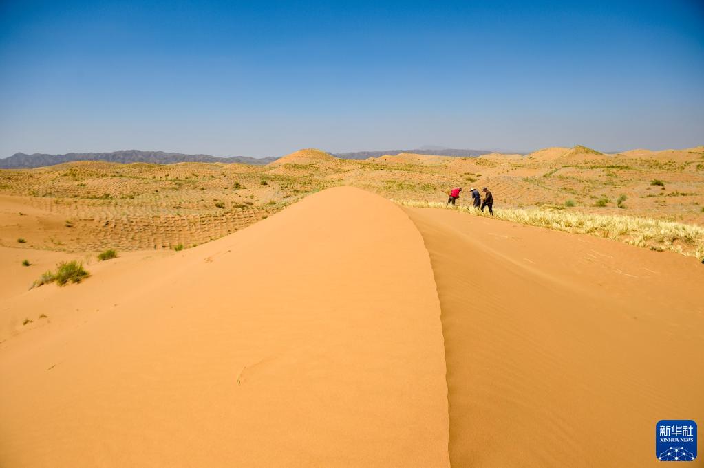 治沙工人在寧夏中衛市長流水沙區扎制草方格(2019年6月13日攝)。