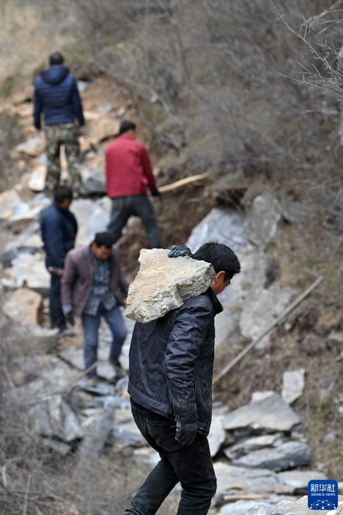 在山西省壺關縣大峽谷鎮青龍峽村,村民在修路現場搬運石頭(2023年3月23日攝)。