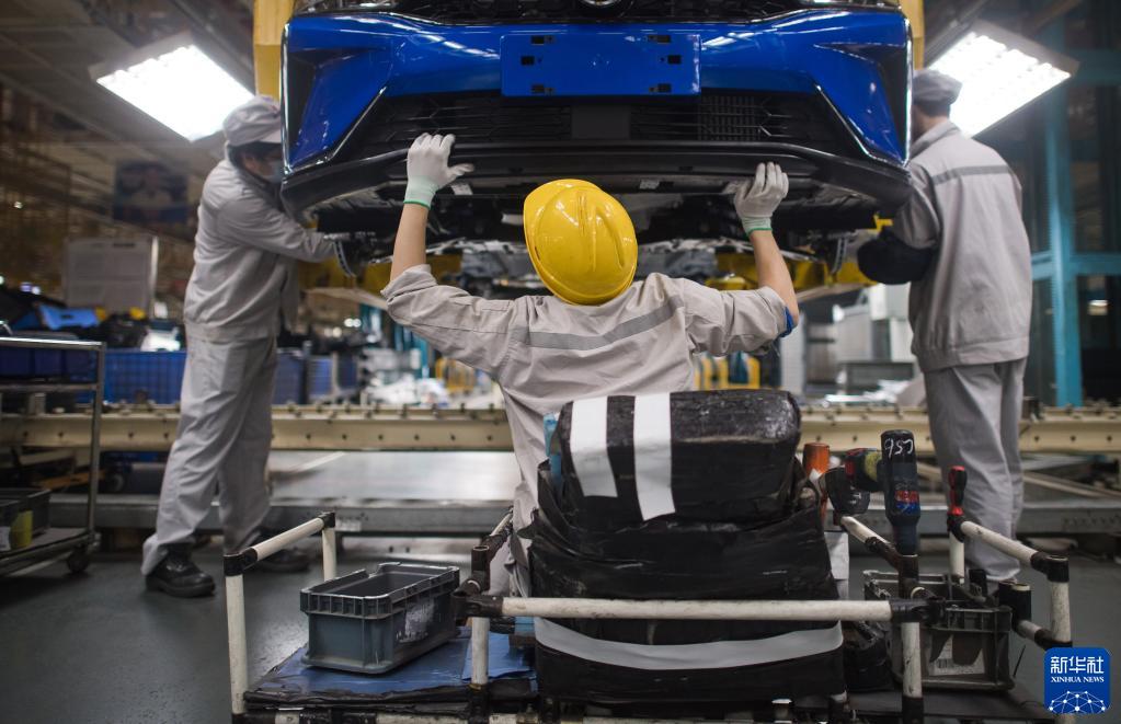 在位于湖北省武漢市的東風乘用車公司工廠總裝車間,工人在流水線上生產作業(2020年3月24日攝)。