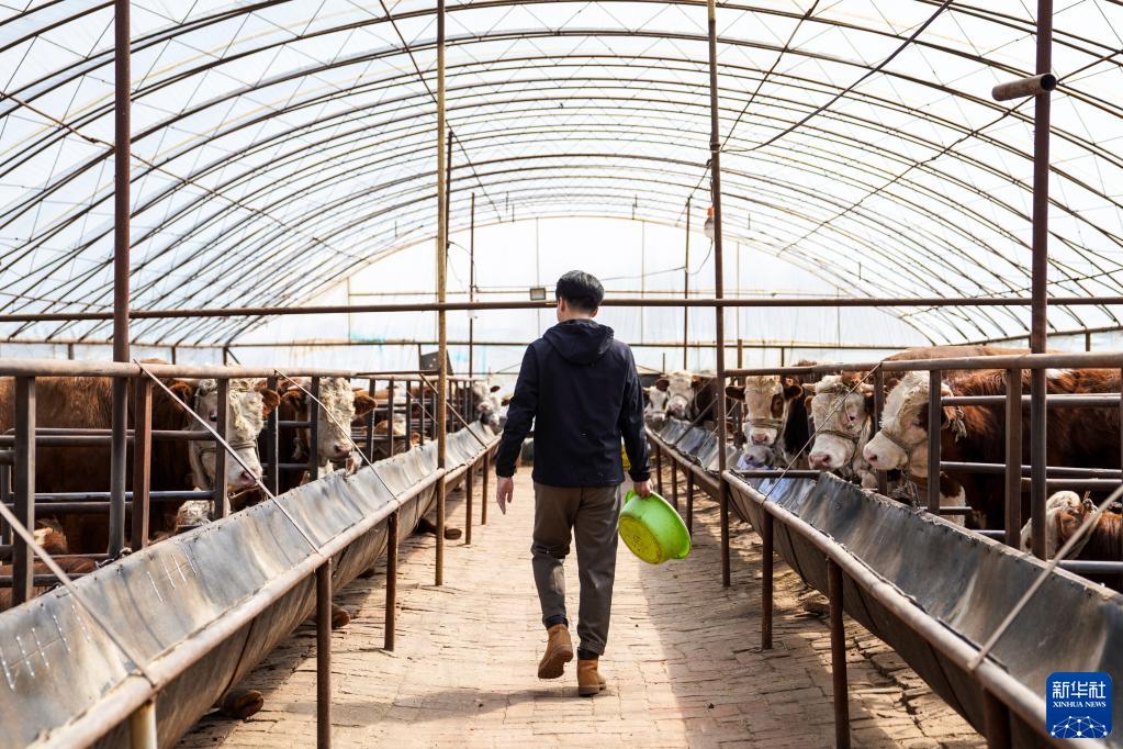 在吉林省松原市寧江區新城鄉的一處牛棚內,駐村工作人員郭松楠在幫老鄉喂牛(2023年4月24日攝)。