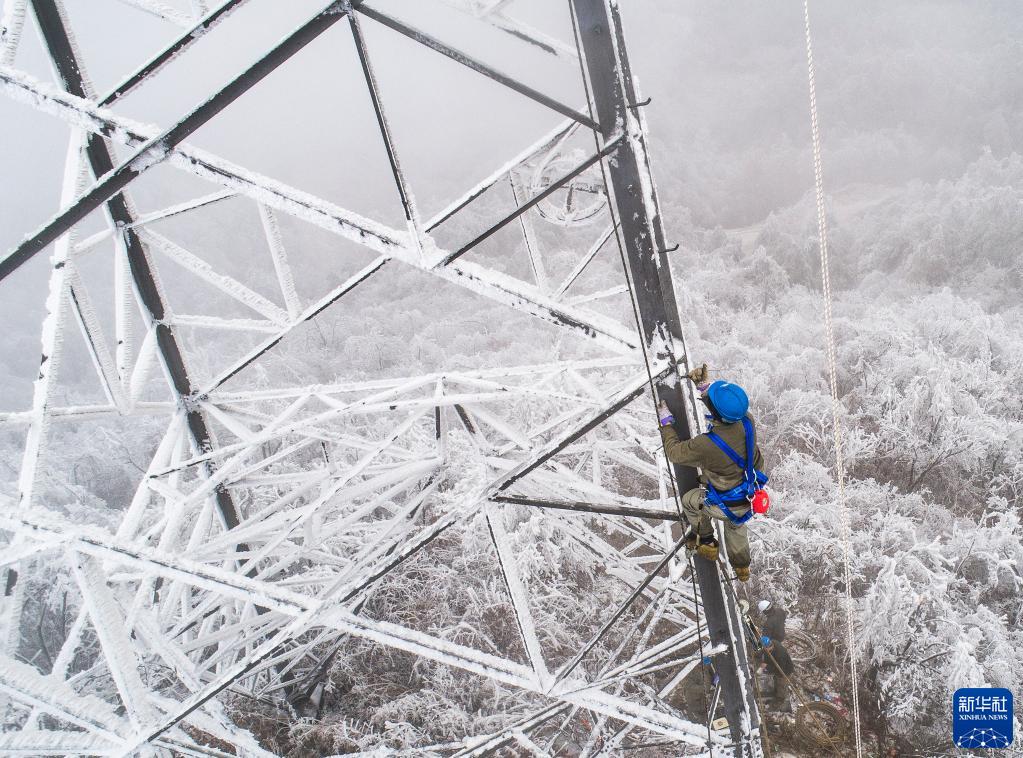 國網武漢市黃陂區供電公司工作人員在進行搶修作業(2019年2月12日攝)。