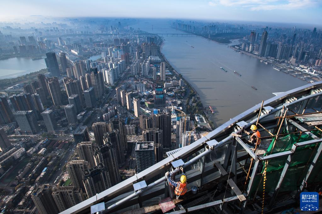 在湖北省武漢市一處建筑工地,工人在進行高空作業(2021年11月15日攝)。