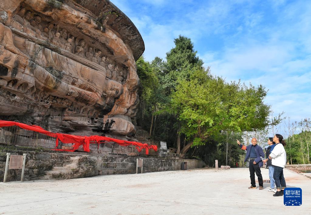 4月3日,吳忠富(左一)在向游客介紹臥佛。