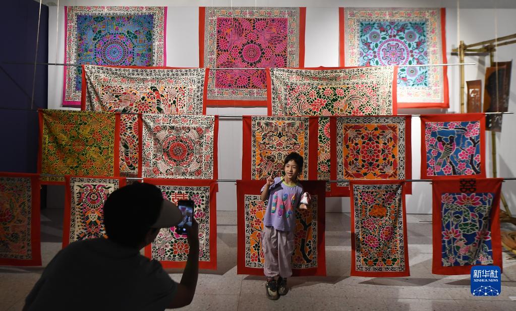 4月30日,觀眾在2023海南錦繡世界文化周非物質文化遺產傳統織繡印染技藝項目精品展上拍照留念。