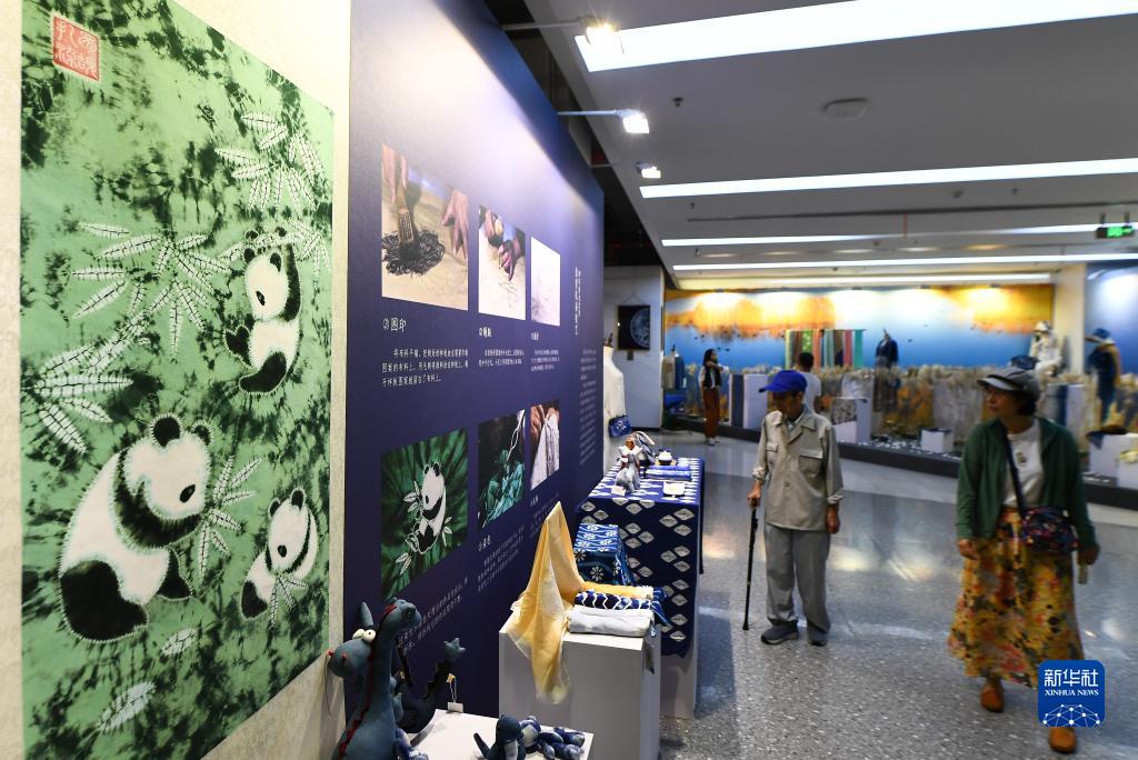4月30日,觀眾在參觀2023海南錦繡世界文化周非物質文化遺產傳統織繡印染技藝項目精品展展出的自貢扎染技藝。