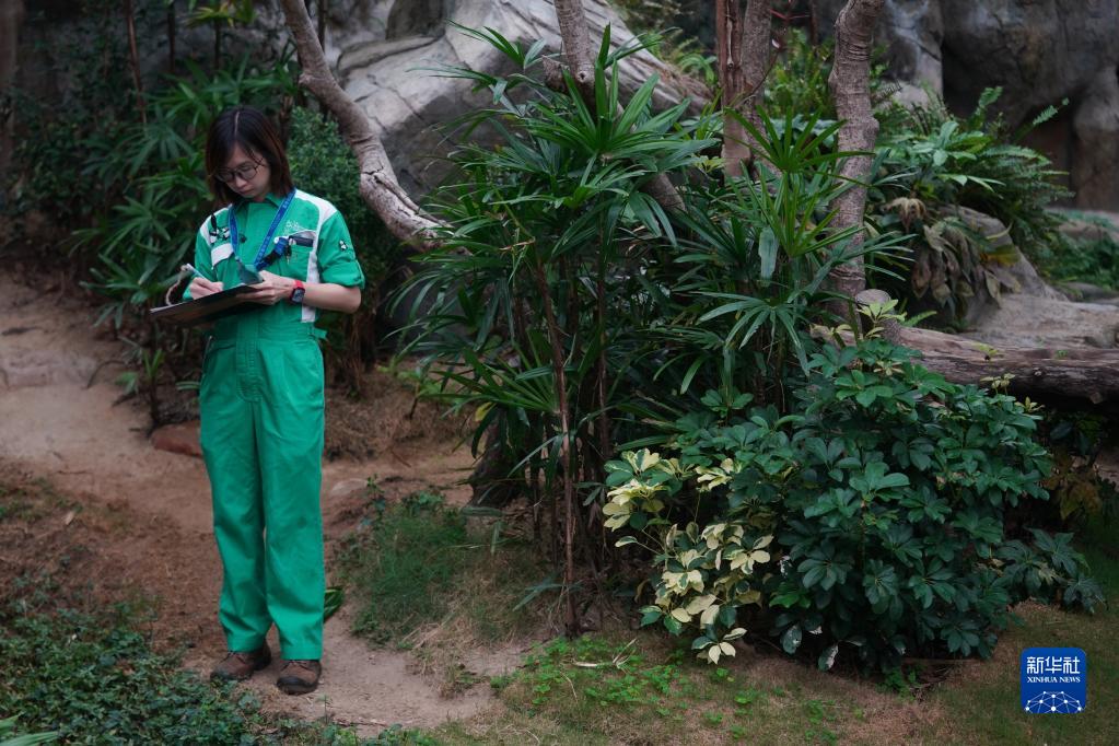 在香港海洋公園,大熊貓“奶媽”胡綺琪在開園前做準備工作(4月19日攝)。