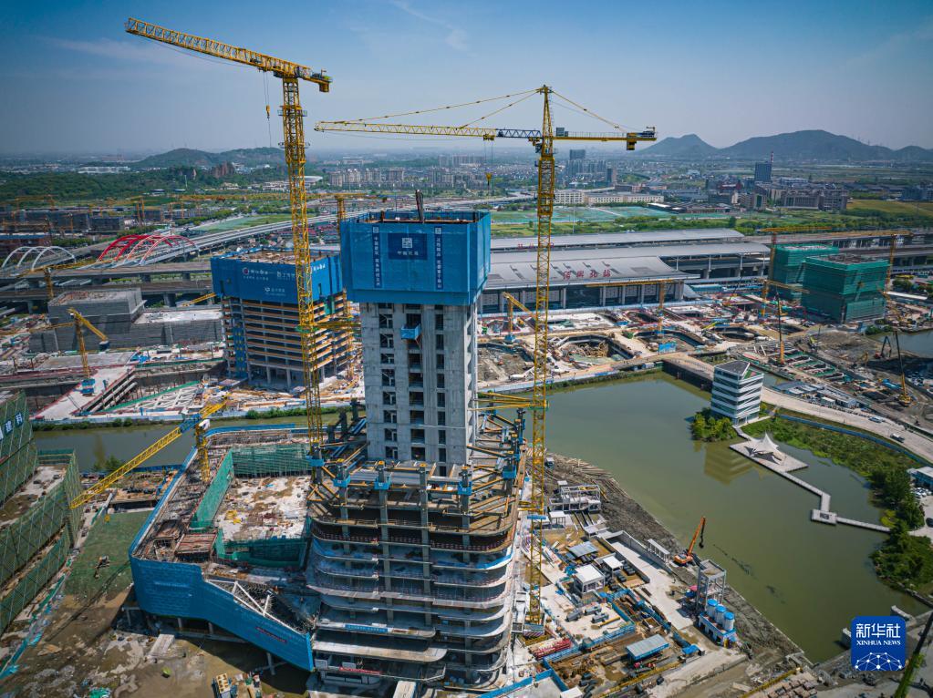 4月30日在浙江紹興拍攝的中建三局紹興北站TOD綜合交通樞紐工程建設現場(無人機照片)。