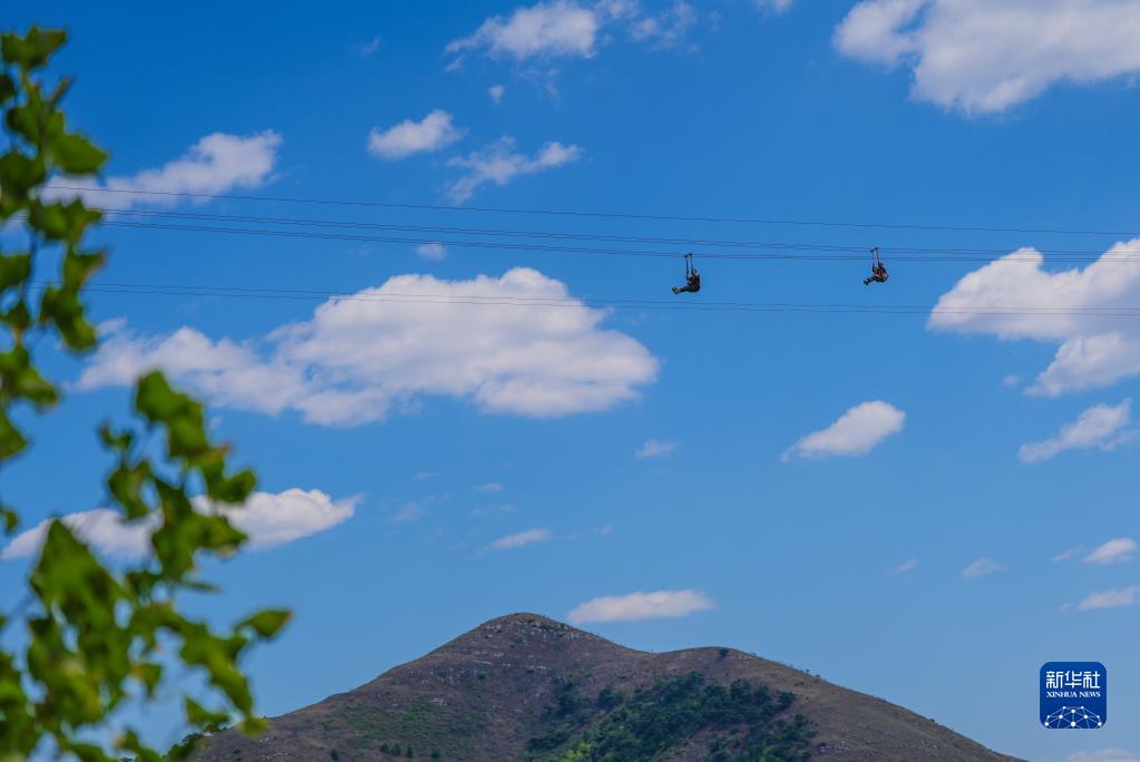 4月30日,游客在河北省遵化市一景區體驗空中索道游樂項目。