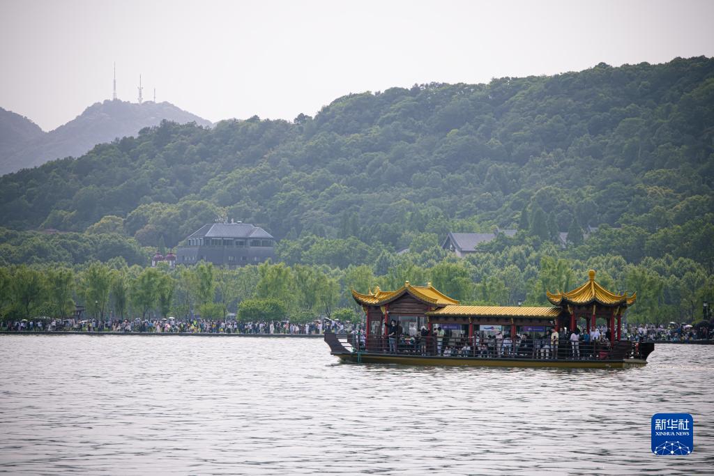 4月30日,滿載游客的游船行駛在杭州西湖水面上。
