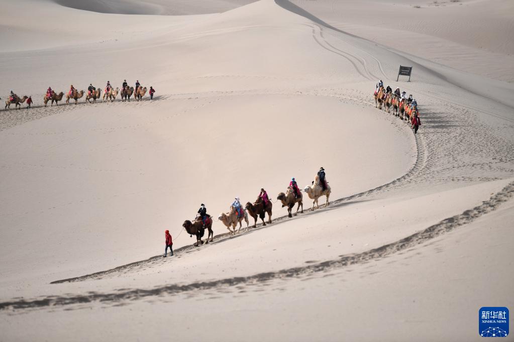 駝隊載著游客行走在鳴沙山月牙泉景區的駝道上(4月24日攝)。