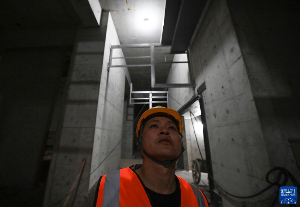 齊國超在施工現場查看頂上的綜合支架安裝工作(4月29日攝)。