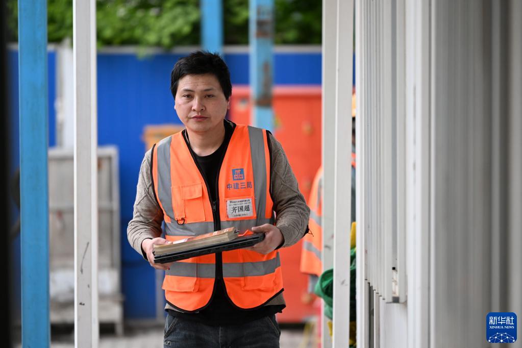 齊國超在工地拿著書和電腦前行(4月29日攝)。