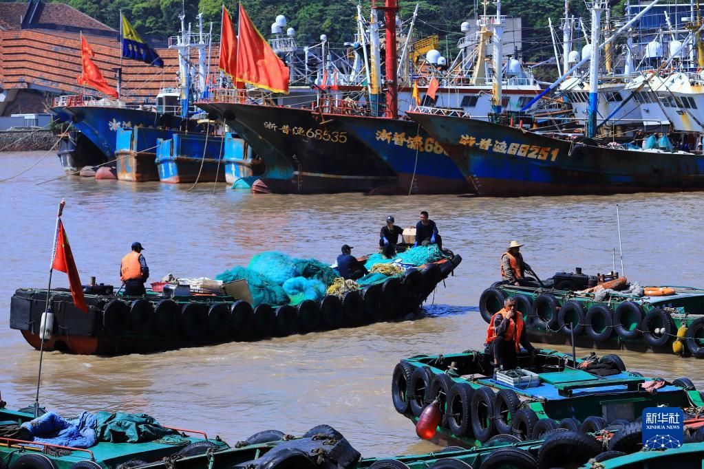 4月30日,浙江省舟山市普陀區沈家門漁港內的小船將網具和漁民從漁船上送回岸邊。