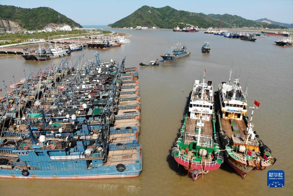 4月30日在浙江省臺州市路橋區金清鎮漁港碼頭拍攝的回港的漁船(無人機照片)。