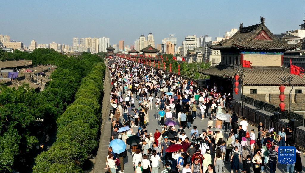 4月30日,游客在西安城墻景區參觀游覽(無人機照片)。