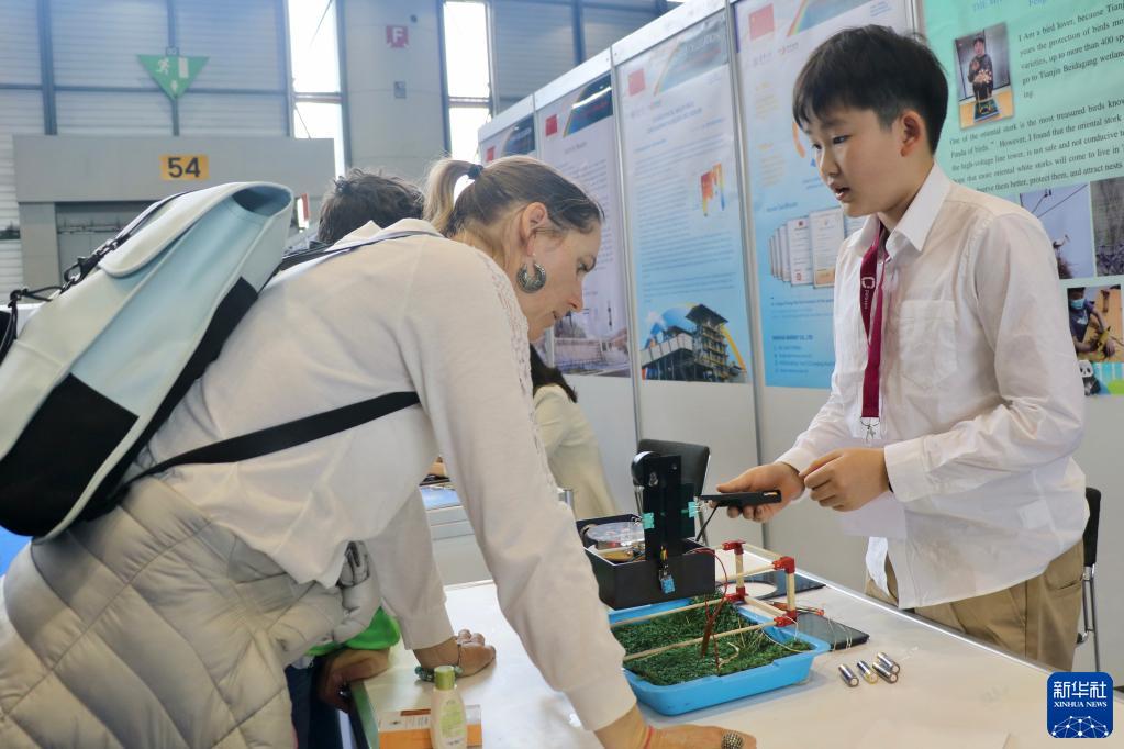 4月26日,在瑞士日內瓦舉行的第48屆日內瓦國際發明展上,中國小學生馮佳澍(右)在展會上用流利的英語向參觀者介紹其作品。年僅11歲的馮佳澍是展會上年齡最小的發明者,他的作品“智慧鳥巢”獲得金獎。