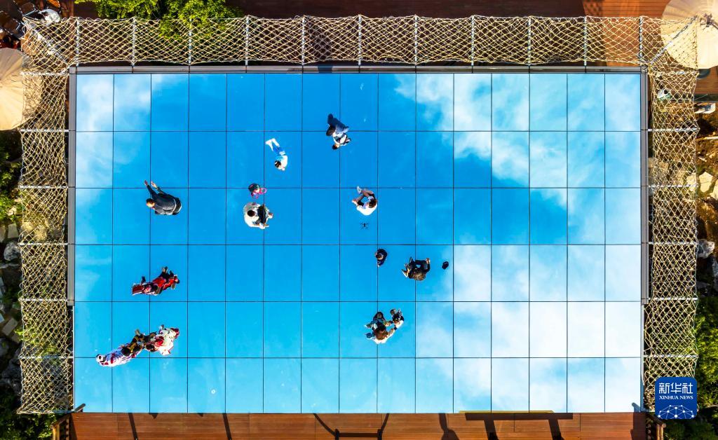 4月29日,游客在貴州省黔西市化屋露營基地“天空之鏡”景點休閑游玩(無人機照片)。