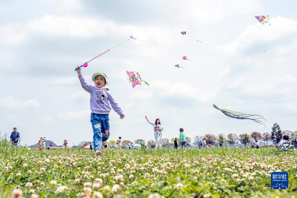 4月30日,小朋友在貴州省畢節市大方縣一家露營基地放風箏。