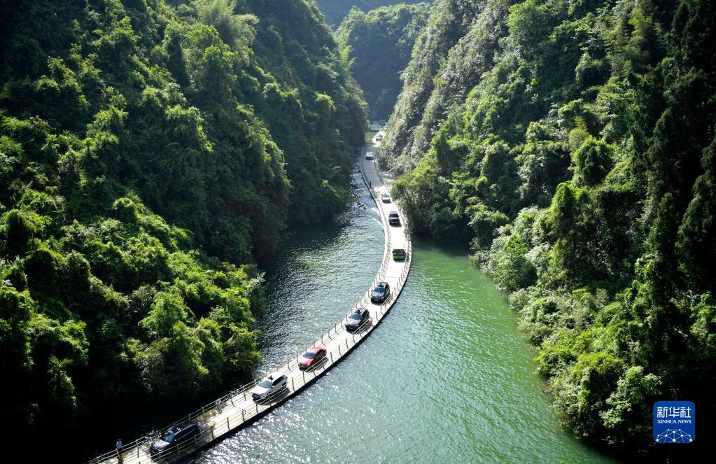 5月1日,游客駕車在湖北省宣恩縣獅子關景區水上浮橋上觀賞景色。
