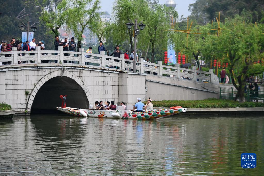 4月29日,游客乘船在福建省福州市西湖公園游玩。