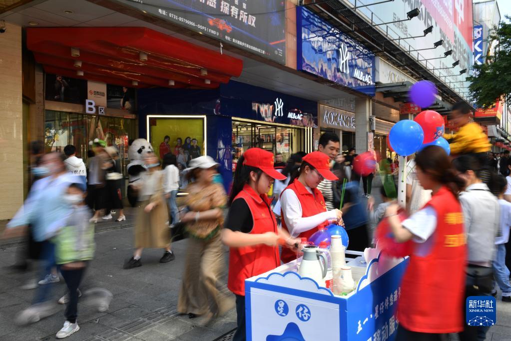 5月1日,志愿者在湖南省長沙市天心區一處商圈做志愿服務。
