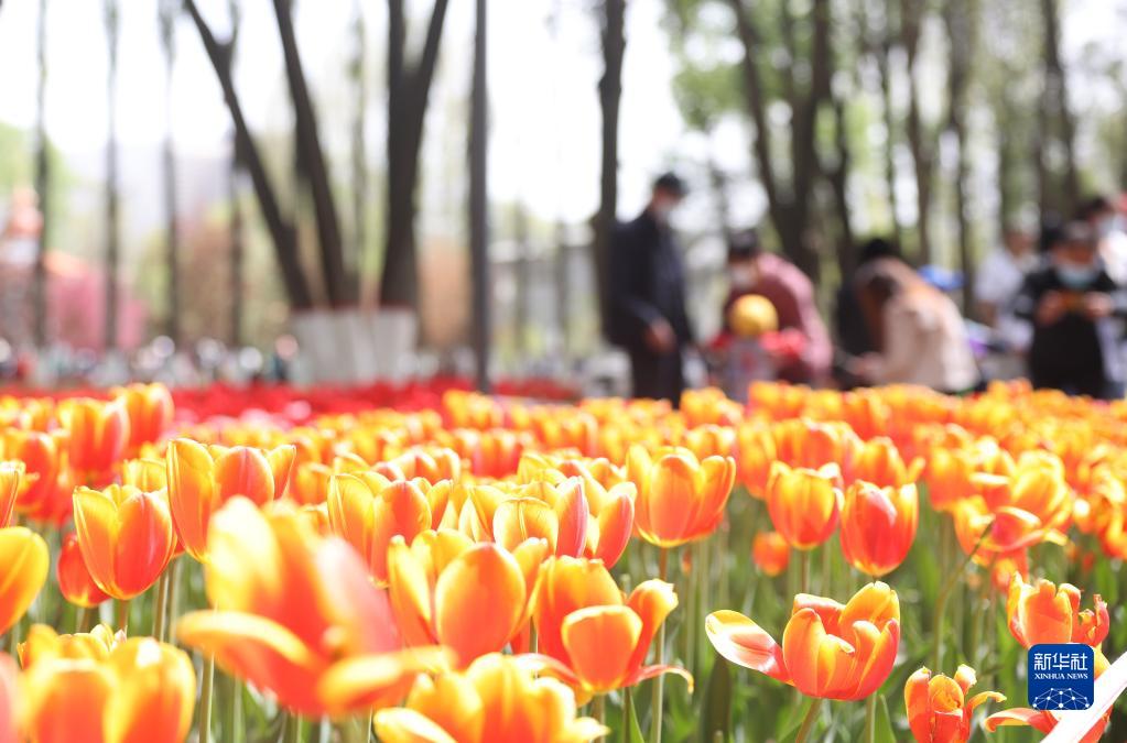 5月1日,游客在青海省西寧市人民公園內觀賞郁金香。