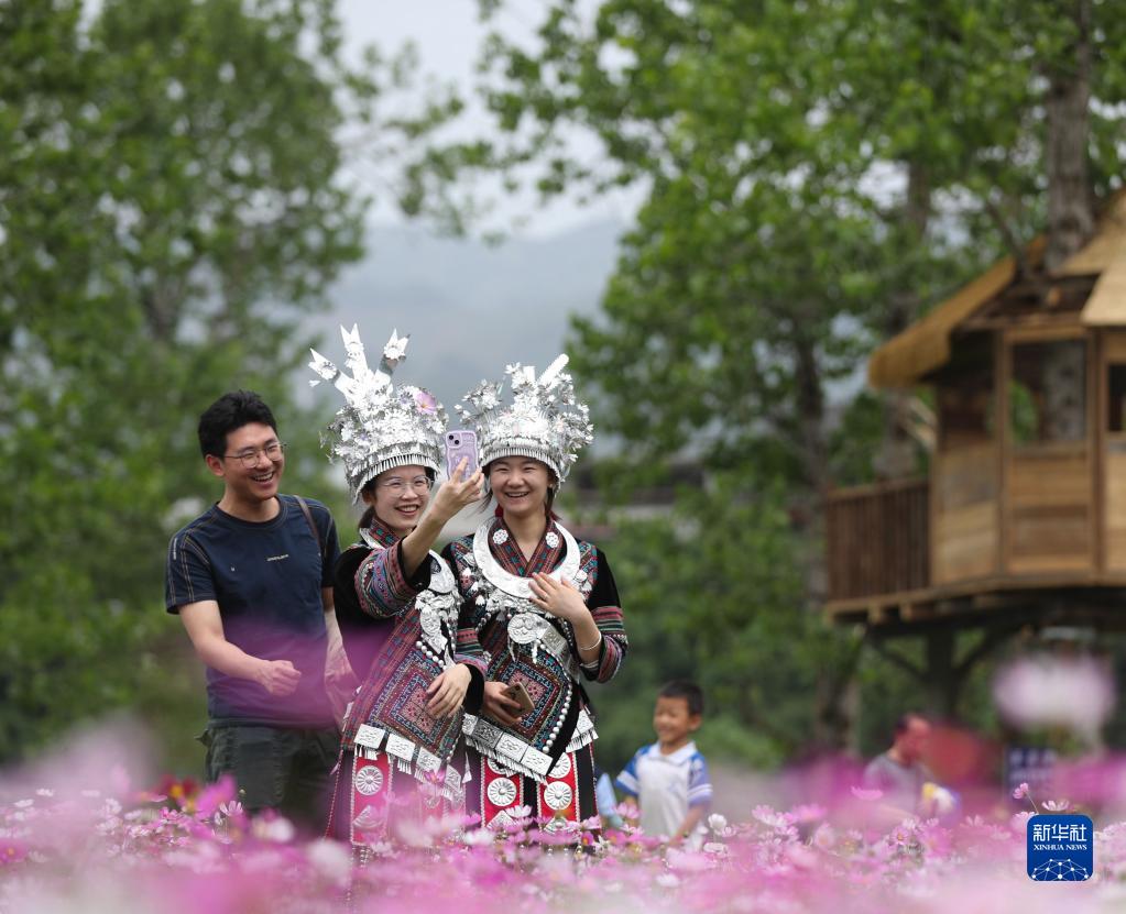 4月30日,游客穿著苗族傳統服飾在貴州省榕江縣苗山侗水風景區賞花游玩。