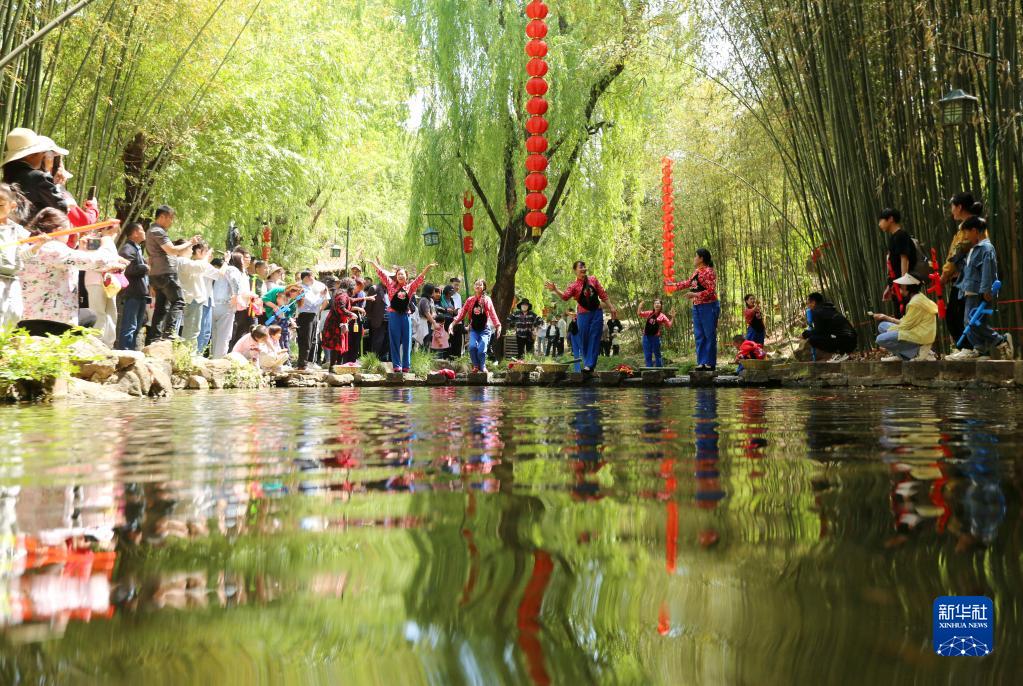 4月30日,游客在山東省臨沂市沂南縣銅井鎮竹泉村觀看民俗表演。