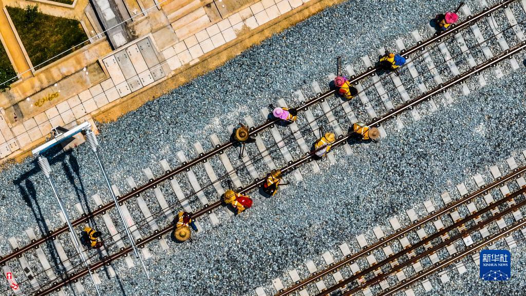 5月1日,中國鐵路南寧局集團有限公司南寧工務段貴南高鐵軌道精調組的工人在貴南高鐵南寧樞紐有砟路段整理道床(無人機照片)。