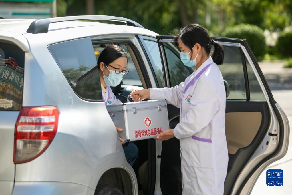 4月30日,在淄博市高青縣田鎮街道,志愿者備好常用藥品準備乘車前往一個燒烤服務點工作。