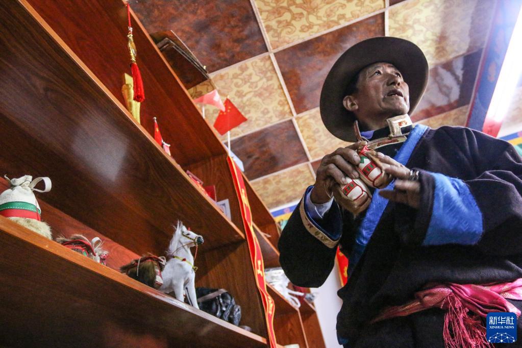 索朗群培展示他制作的工藝品馬包(4月18日攝)。