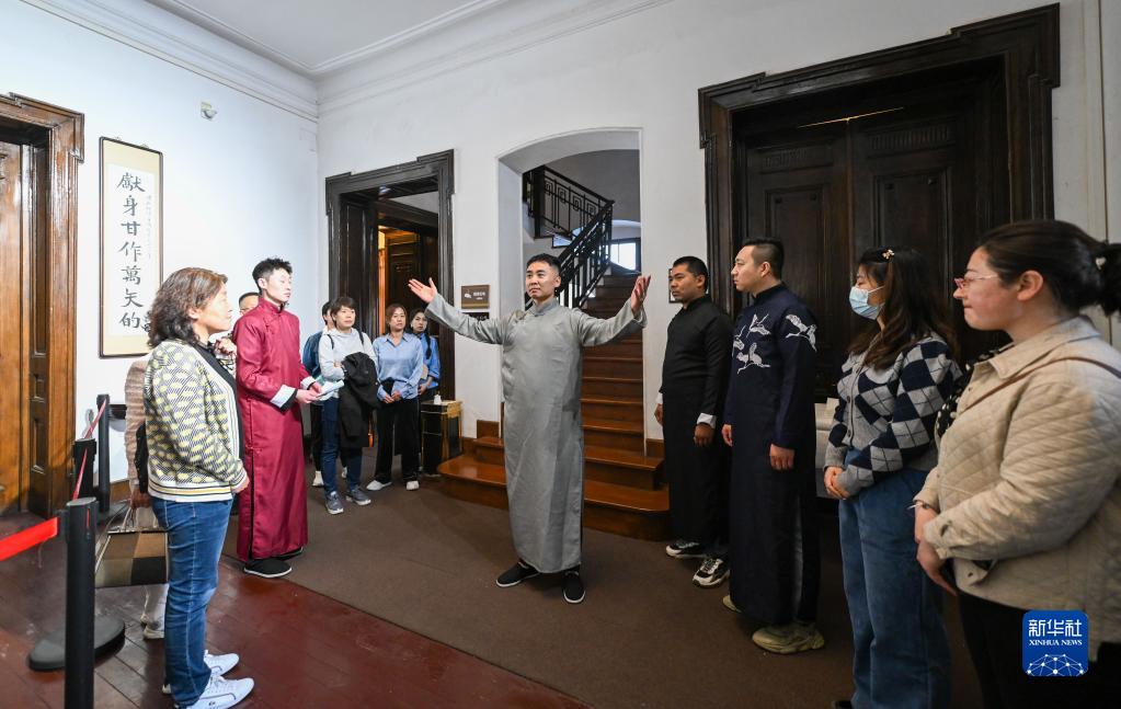 在梁啟超紀念館飲冰室,話劇演員與游客進行互動式沉浸演出(4月29日攝)。