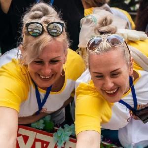 5月1日,來自國內外的雙胞胎在參加國際雙胞胎節大巡游。