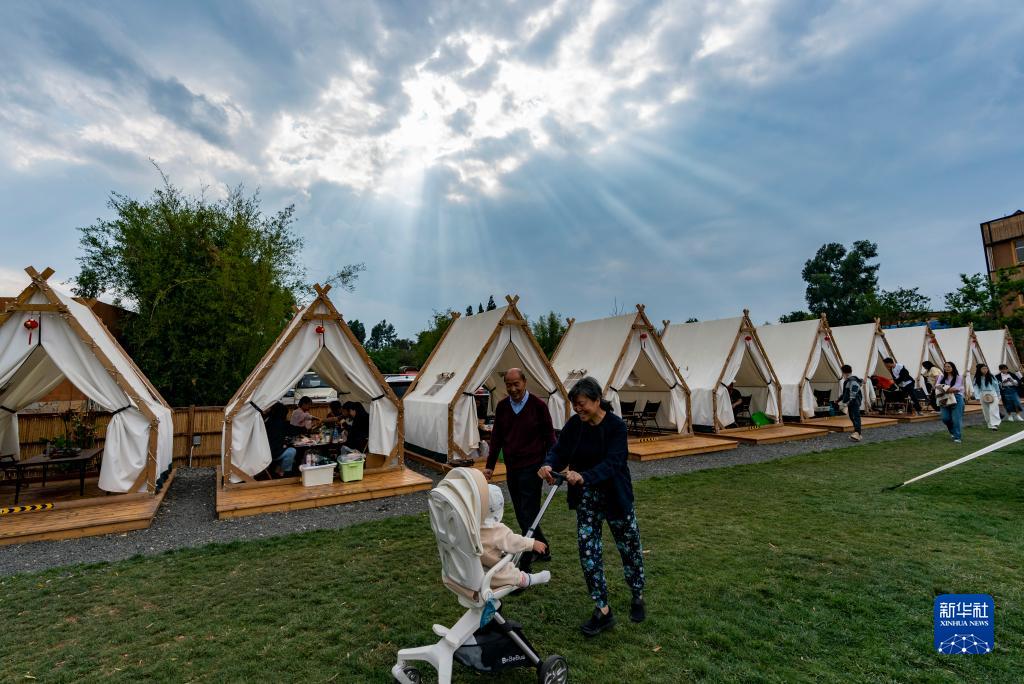 4月30日,游客推著嬰兒車在小漁村露營基地游玩。