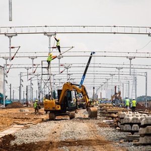 5月1日,在印度尼西亞萬隆,建設者在雅萬高鐵德卡魯爾動車所施工現場作業。