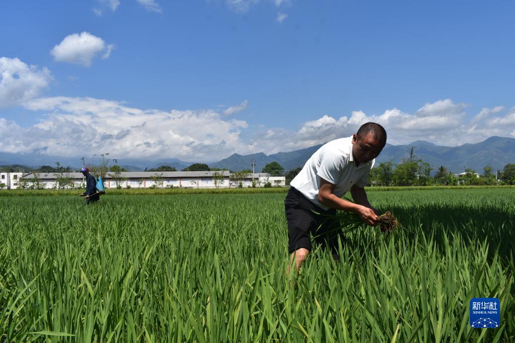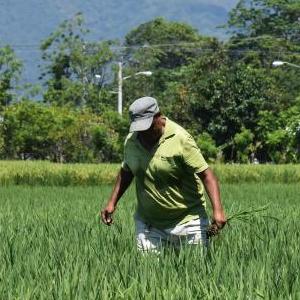 4月26日,在多米尼加首都圣多明各西北約80公里處,中國農業專家(前)在多米尼加國家水稻培訓中心的一片試驗田內工作。