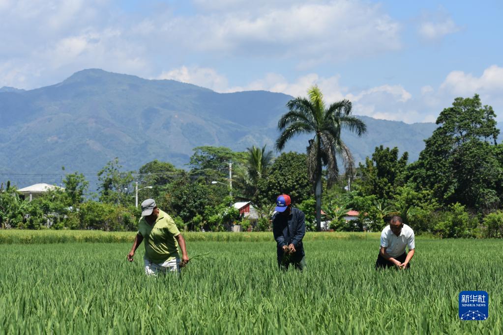 4月26日,在多米尼加首都圣多明各西北約80公里處,中國農業專家(右)和當地農民在多米尼加國家水稻培訓中心的一片試驗田內工作。