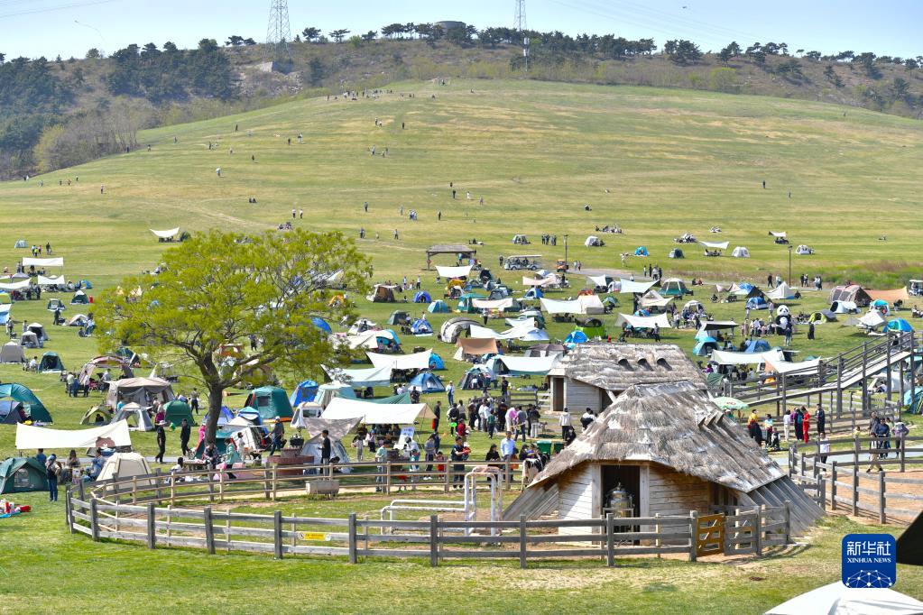 5月1日,游客在遼寧省大連市三寰牧場景區搭帳篷露營。