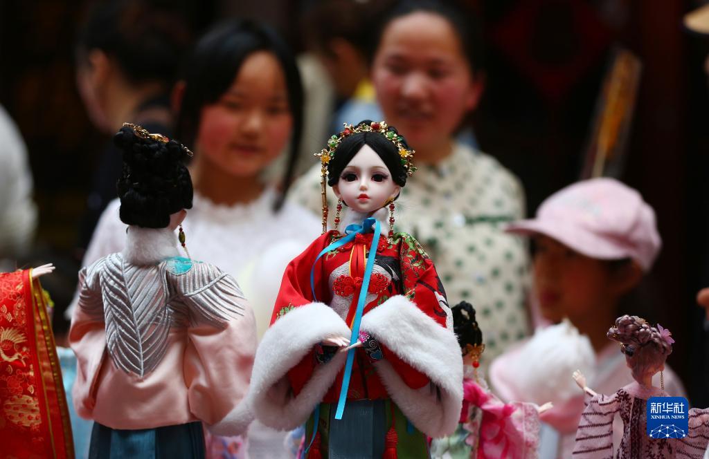 5月2日,游客在山東省滕州市“黃河大集·龍泉廟會”上欣賞玩偶。