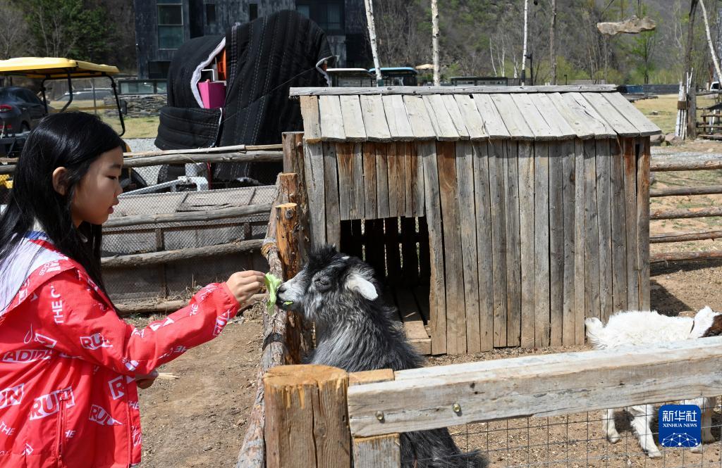 5月2日,游客在河北省隆化縣一處溫泉度假區內喂羊。
