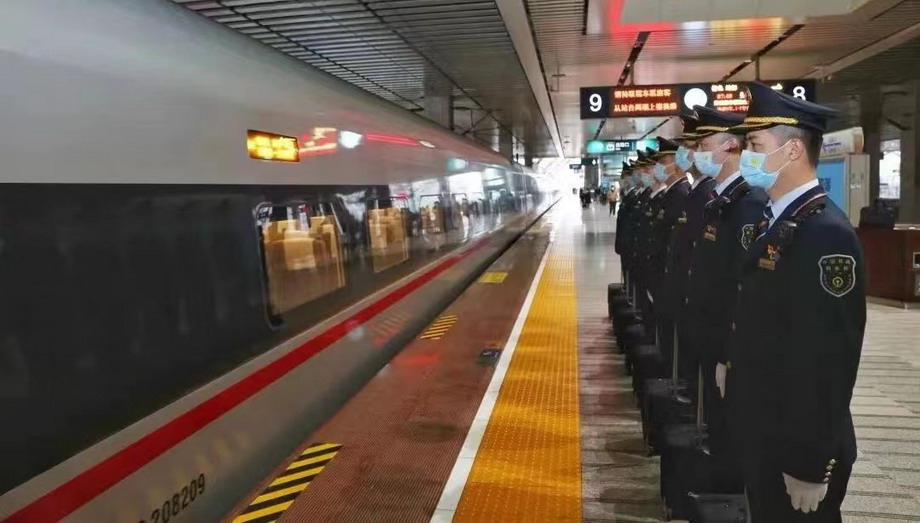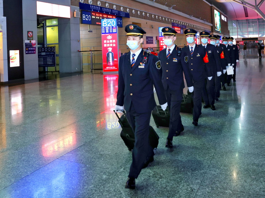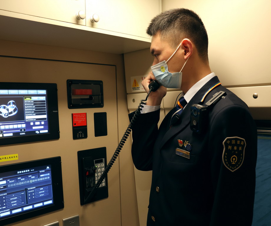 五一假期期間,長沙客運段動二車隊G1348次高鐵上“鐵男組”乘組光榮在崗。圖為長沙客運段動二車隊G1348次出乘。新華網發