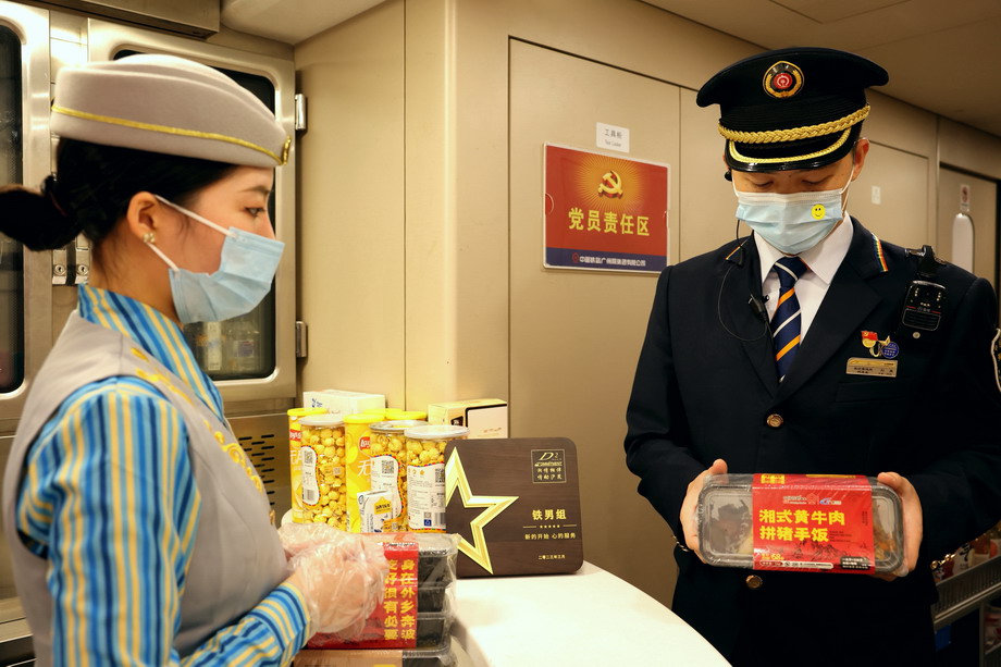 五一假期期間,長沙客運段動二車隊G1348次高鐵上“鐵男組”乘組光榮在崗。圖為長沙客運段動二車隊黨員列車長劉堅始發前對食品安全進行檢查。新華網發